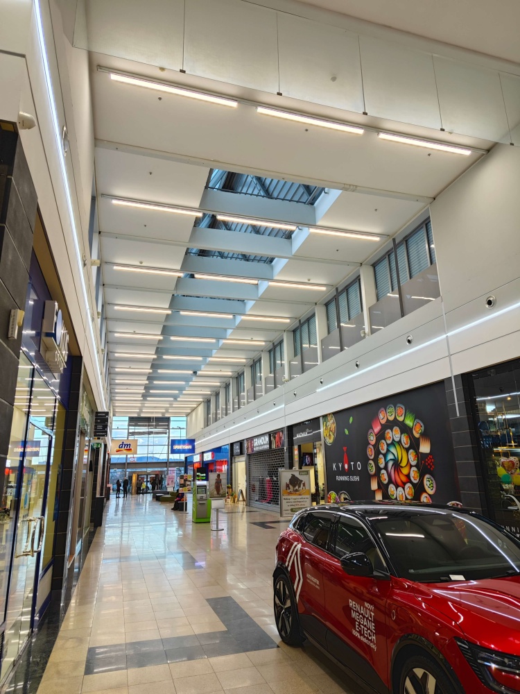 Místo instalace - zázemí a pasáž nákupního centra. Použité osvětlení - LINEAR E120 30W-840, ORBIT 31 120W-840-60D, BUBU 32 100W-740-BAT, FLAT 0606 36W-840-120D, FLAT E 1203 36W-840-120D
