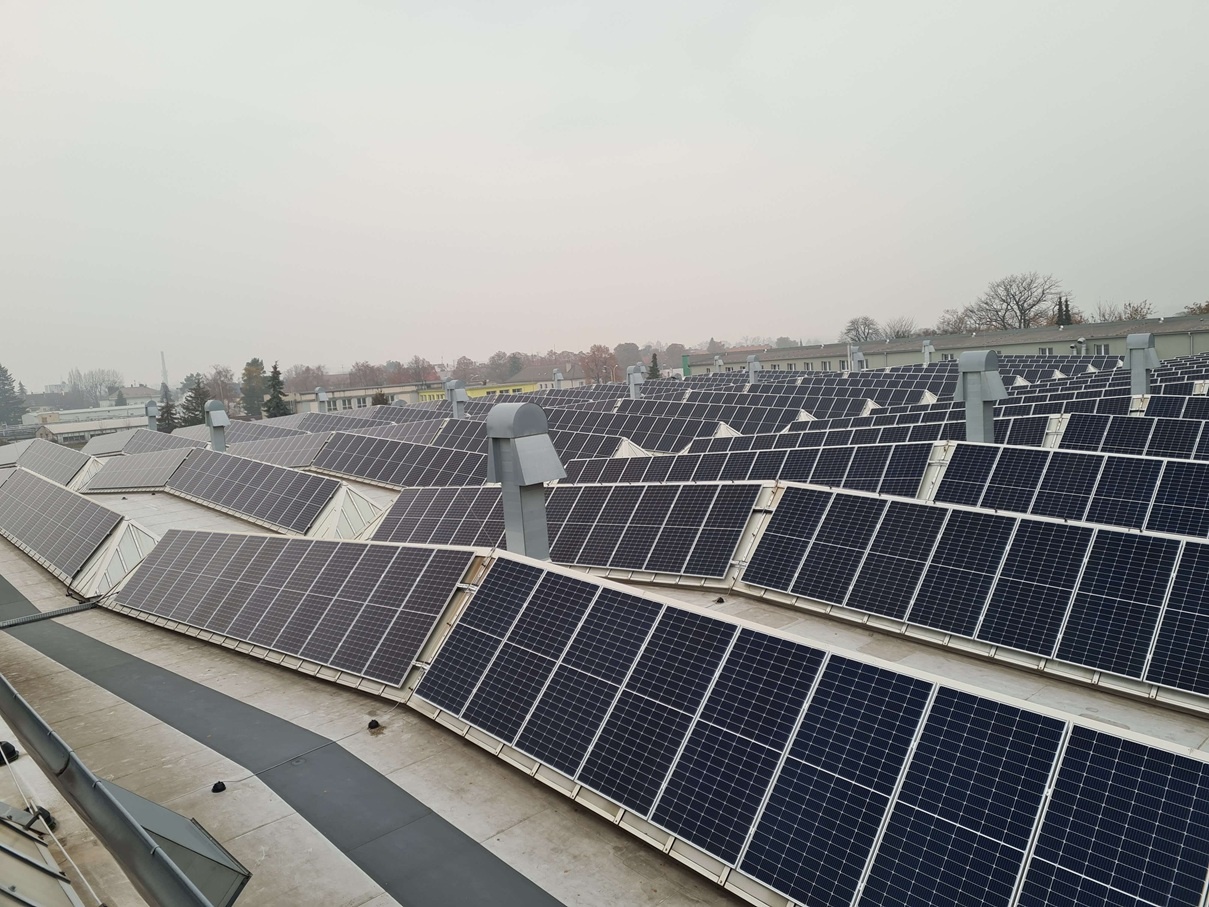 Na střeše jsme instalovali 1 750 panelů s optimizéry a 6 střídačů SolarEdge, doplněných o DC/AC rozvodnice a napojení do přípojného bodu. Zajistili jsme také přeložení hromosvodů a sladili rozmístění panelů s technologiemi klimatizací.