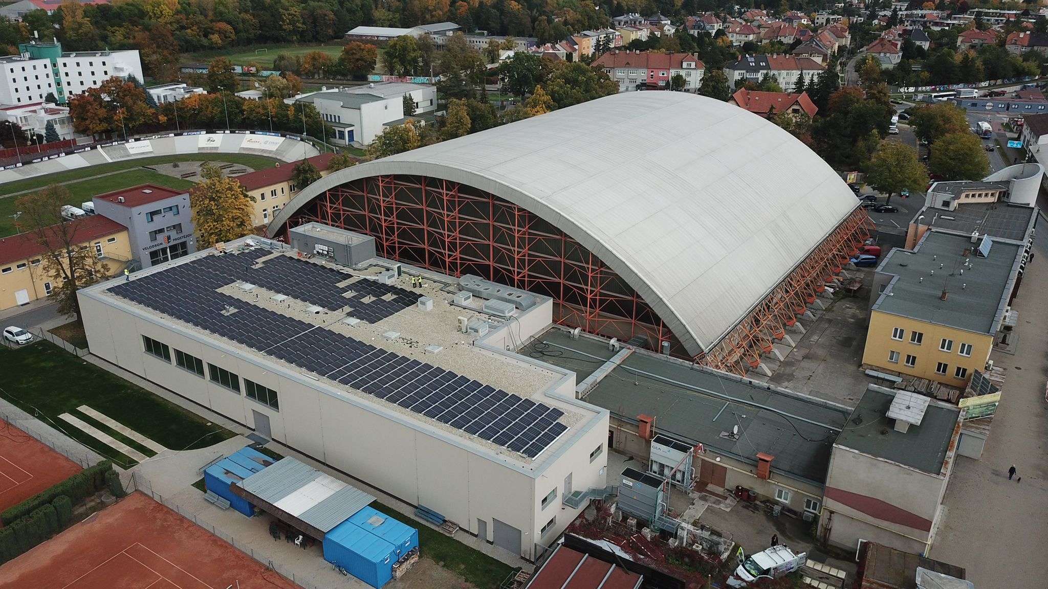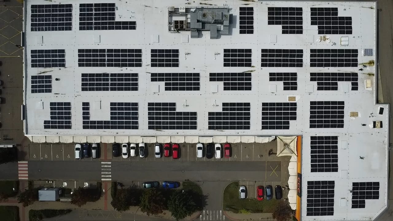 Na střeše jsme instalovali 1 750 panelů s optimizéry a 6 střídačů SolarEdge, doplněných o DC/AC rozvodnice a napojení do přípojného bodu. Zajistili jsme také přeložení hromosvodů a sladili rozmístění panelů s technologiemi klimatizací.